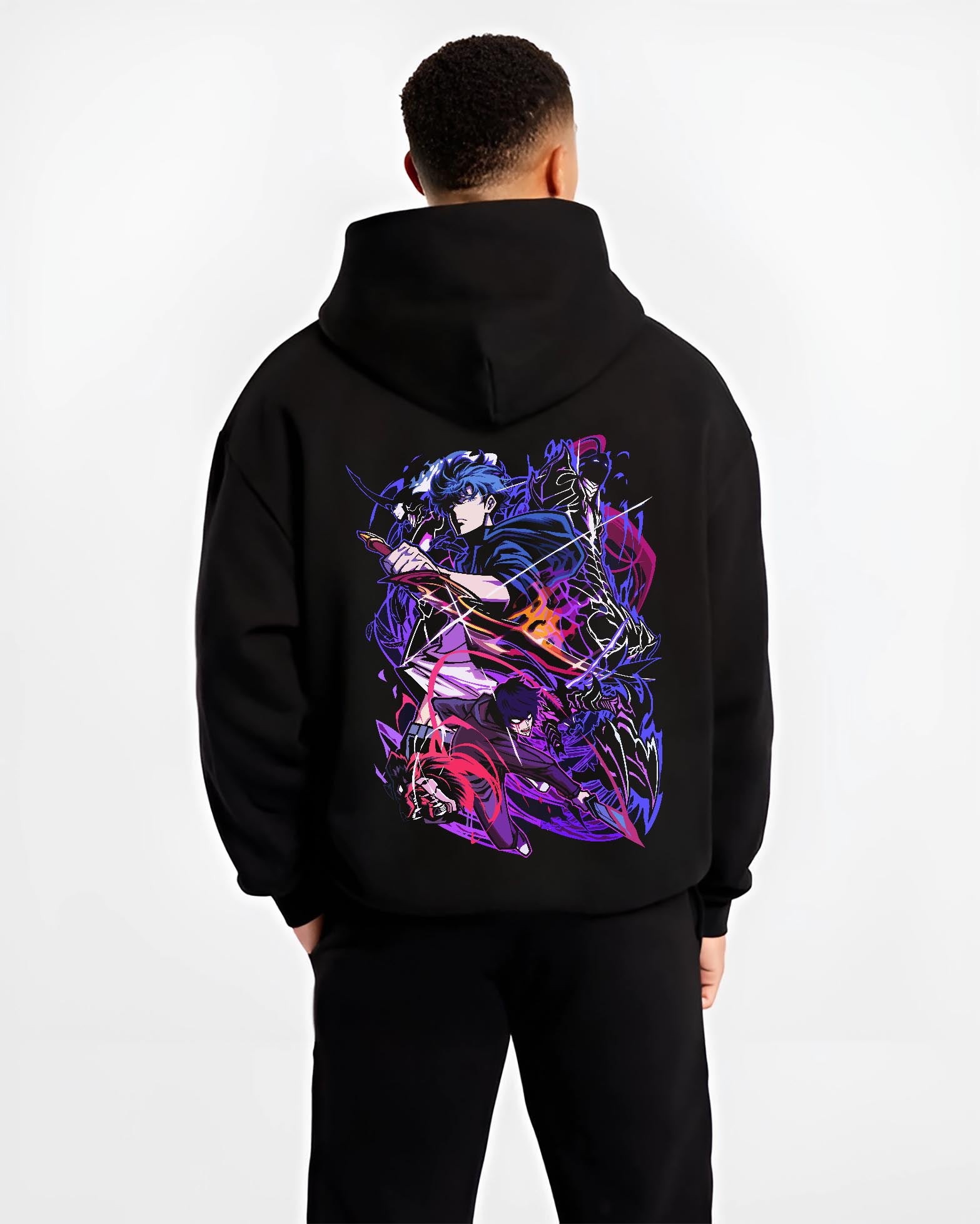 Premium quality anime hoodie featuring authentic design elements and comfortable fit. Own the power-up look of Jinwoo Sung from Solo Leveling in this unique, premium design. Available as a hoodie, premium sweatshirt/jumper, or oversized T-shirt, the artwork channels the Shadow Monarch aura with ebon summons and twin-dagger stance. Clean lines and bold contrast make standout anime clothing that pairs with modern streetwear. A sharp gift for fans—premium yet affordable—for birthdays, valentine, or christmas/xmas.